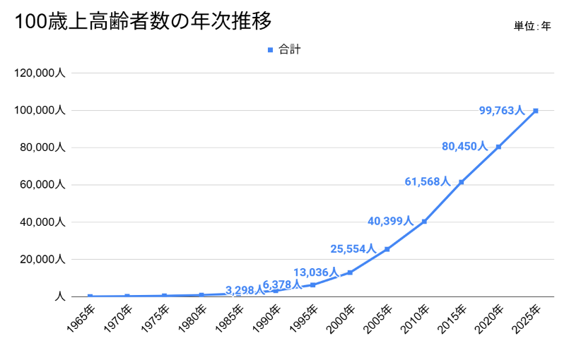 100歳上の高齢者の総数※は、令和7年9月15日現在で99,763人(前年度比+4,644人)です。男性は11,979人、女性は87,784人です。昭和56年(1981年)に千人を超え、平成10年(1998年)に1万人を超え、平成24年(2012年)に5万人を超えました。